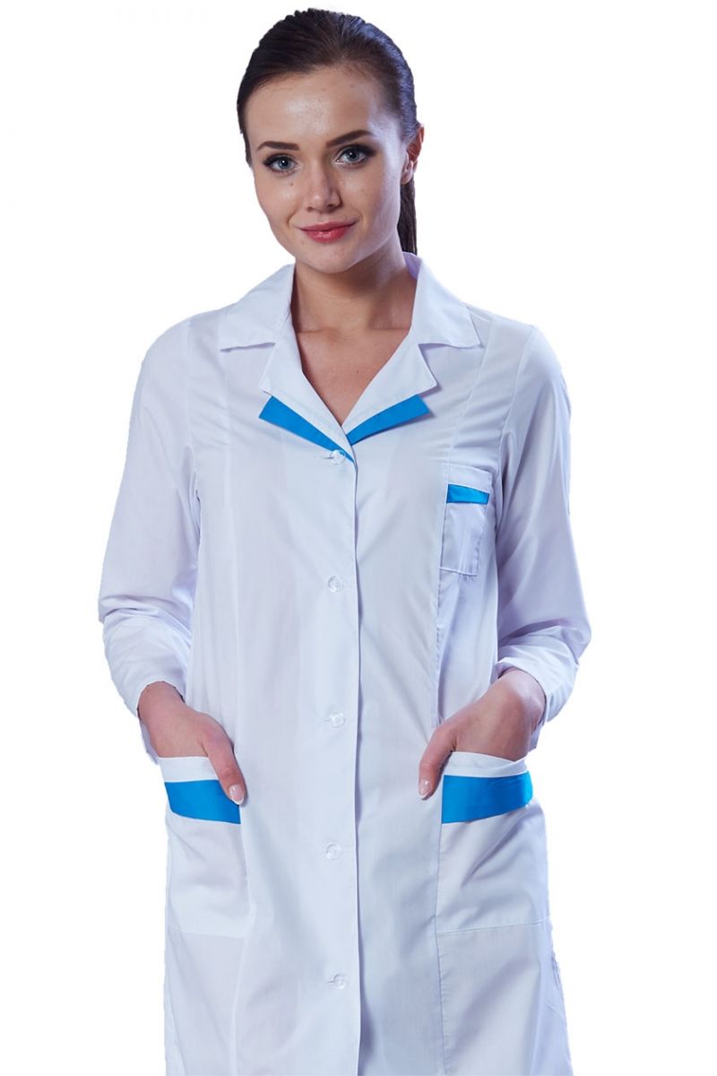 Халат с центральной бортовой застежкой на пуговицы. Полочки с рельефами от линии плеча, с одним нагрудным и двумя нижними накладными карманами. Спинка с хлястиком. Рукава втачные одношовные. Воротник отложной, с лацканами с декоративными деталями. На карманах декоративные детали.