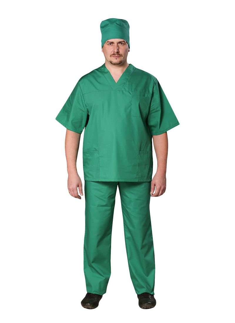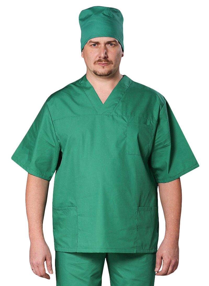 Рубашка с V-образной горловиной, обработанная отделочной обтачкой. Передняя часть с отрезной кокеткой, с одним верхним и двумя нижними накладными карманами. Нижние карманы входят в боковые швы. Рукава втачные одношовные, короткие.