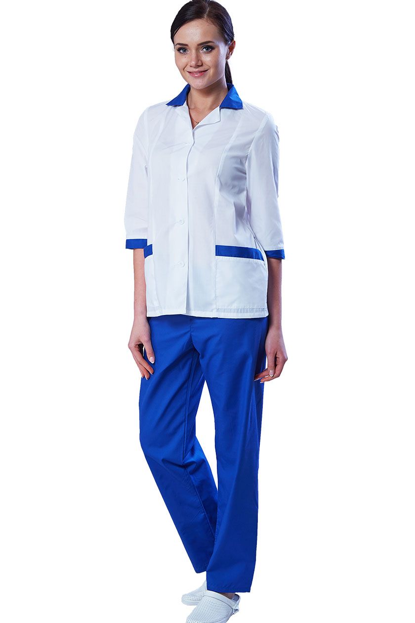 Блузка с центральной бортовой застежкой на пуговицы. Полочки с рельефами от линии плеча, с двумя нижними накладными карманами. Верхние срезы карманов обработаны контрастной отделкой. Спинка с хлястиком, втачанным в боковые швы. Воротник отложной, с лацканами. Верхний воротник контрастного цвета. Рукава втачные одношовные, с отделочными василькового цвета.