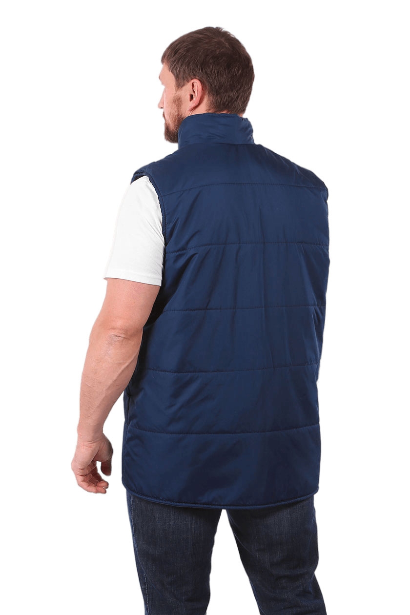 Жилет прямого силуэта, с центральной застежкой на тесьму «молния». Два нижних прорезных кармана с наклонным входом.