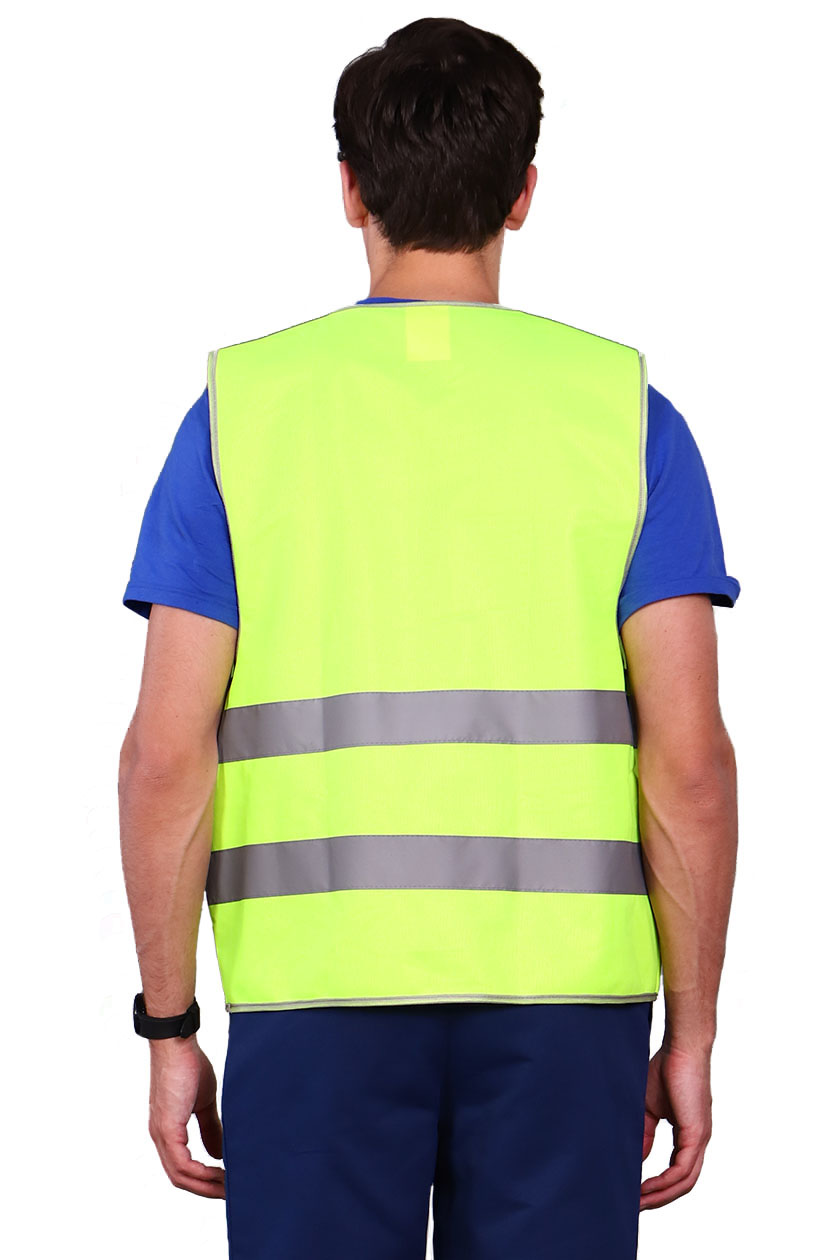 Жилет прямого силуэта, центральная застежка на липучку. Две полосы СОП 50 мм расположены на передних полочках и спинке в два ряда.